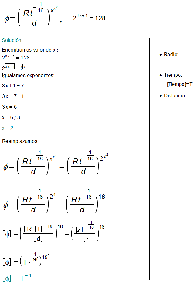 donde: R= radio, t= tiempo, d= distancia. Calcular las dimensiones de \phi, si 2^{3x+1}=128